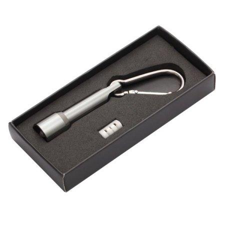 Brelok latarka LED z karabińczykiem. Zasilana 4 bateriami AG3 (dołączone do produktu). Pakowana w czarne opakowanie upominkowe.