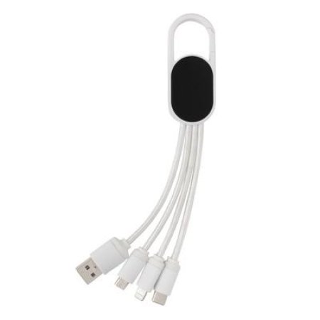 Kabel do ładowania 4 w 1 z karabińczykiem z 3 końcówkami: USB, USB typu C oraz końcówką 2 w 1 (micro USB oraz kompatybilną z urządzeniami iOS), obudowa wykonana z ABS, nylonowe kable o długości 10 cm, obsługuje ładowanie do 2.1A