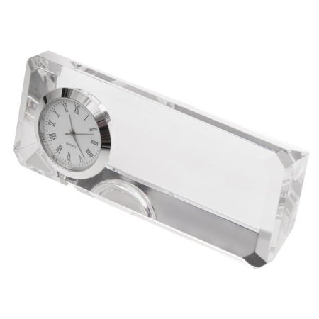 Kryształowy przycisk do papieru z zegarem. Pakowany w czarne upominkowe pudełko i nasuwane kartonowe opakowanie. Aby uruchomić zegar należy wyjąć go z kryształowej obudowy i usunąć element zabezpieczający. Dostępna opcja druku XL. W zestawie bateria AG4 1szt.
