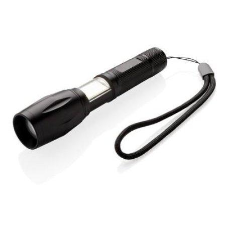 Latarka CREE 10W ze zintegrowanym światłem COB (165 lumenów) do oświetlania przedmiotów w niedużej odległości i poliestrowym paskiem na rękę, zasięg światła CREE LED do 300 m (285 lumenów), światło LED z funkcją zoom oraz 3 trybami oświetlenia (silny, normalny, światło migające), światło COB z 2 trybami (COB i czerwone światło bezpieczeństwa), baterie w komplecie