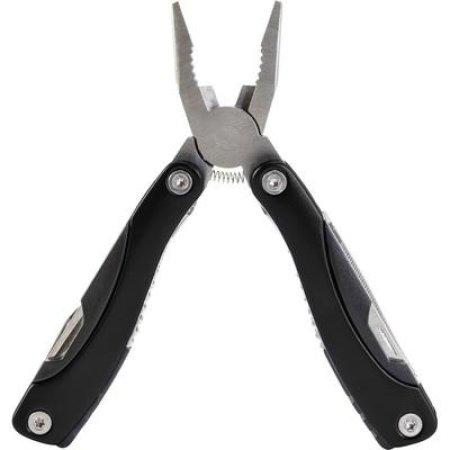 Narzędzie wielofunkcyjne, 10 funkcji: kombinerki, piła, nóż, 2 śrubokręty (płaski i krzyżakowy), pilnik, otwieracz do butelek, skrobak do ryb, dziadek do orzechów, linijka (w calach), w pokrowcu