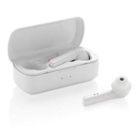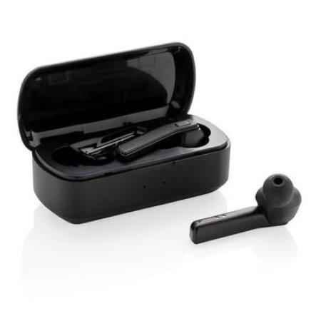 Bezprzewodowe słuchawki douszne stereo, BT 5.0, wbudowany mikrofon, funkcja odbierania połączeń, wykonane z ABS etui z akumulatorem 500 mAh pełniące funkcję stacji ładującej w komplecie, akumulator słuchawek o pojemności 35 mAh umożliwia odtwarzanie muzyki na średnim poziomie głośności do 3 godzin, ponowne naładowanie za pomocą etui w 1 godzinę, zasięg do 10 m, 3 rozmiary nakładek dousznych w komplecie
