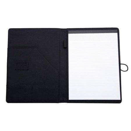 Wykonana z mikrofibry i poliestru teczka A4 wyposażona w 20 kartkowy notatnik w linie, 2 małe kieszonki, przegródkę na dokumenty, oraz miejsce na 3 długopisy. Długopis i telefon nie są dołączone.