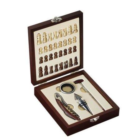 Oryginalny zestaw składający się z szachów oraz akcesoriów do wina. Wykonany z metalu i MDF. Figury szachowe wykonane są z plastiku. Na akcesoria do wina składają się: nóż kelnerski, okapnik, zatyczka oraz termometr. Dostępna opcja zdobienia full color (druk UV).