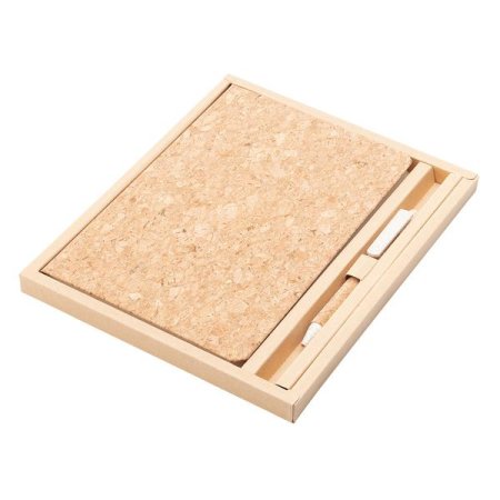 Zestaw korkowy składający się z notesu o wymiarach: 14 x 21cm (gramatura 1250 g), 80 kartek w linie 70 g/m2 oraz korkowego długopisu. Pakowany w kartonowe pudełko.