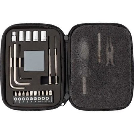 Zestaw narzędzi 24 el., 5 kluczy nasadowych, 3 wkrętaki sześciokątne, 9 końcówek wkrętakowych, 1 nasadka, 1 miara, 2 wkrętaki precyzyjne, 1 uchwyt do śrubokręta, 1 przedłużka, 1 szczypce, w skórzanym etui na zamek błyskawiczny
